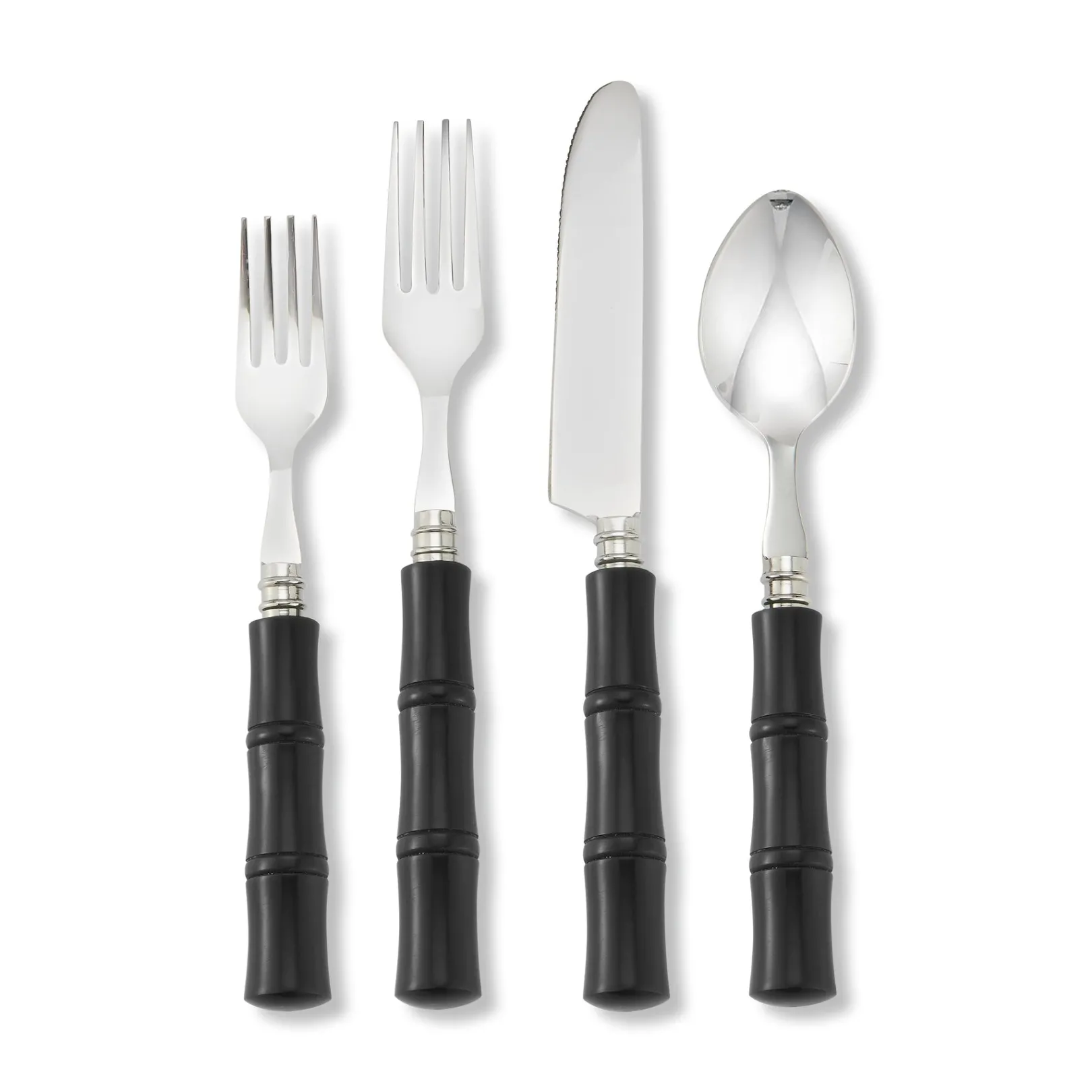 The handles are black resin in the shape of bamboo, and the metal is stainless steel.