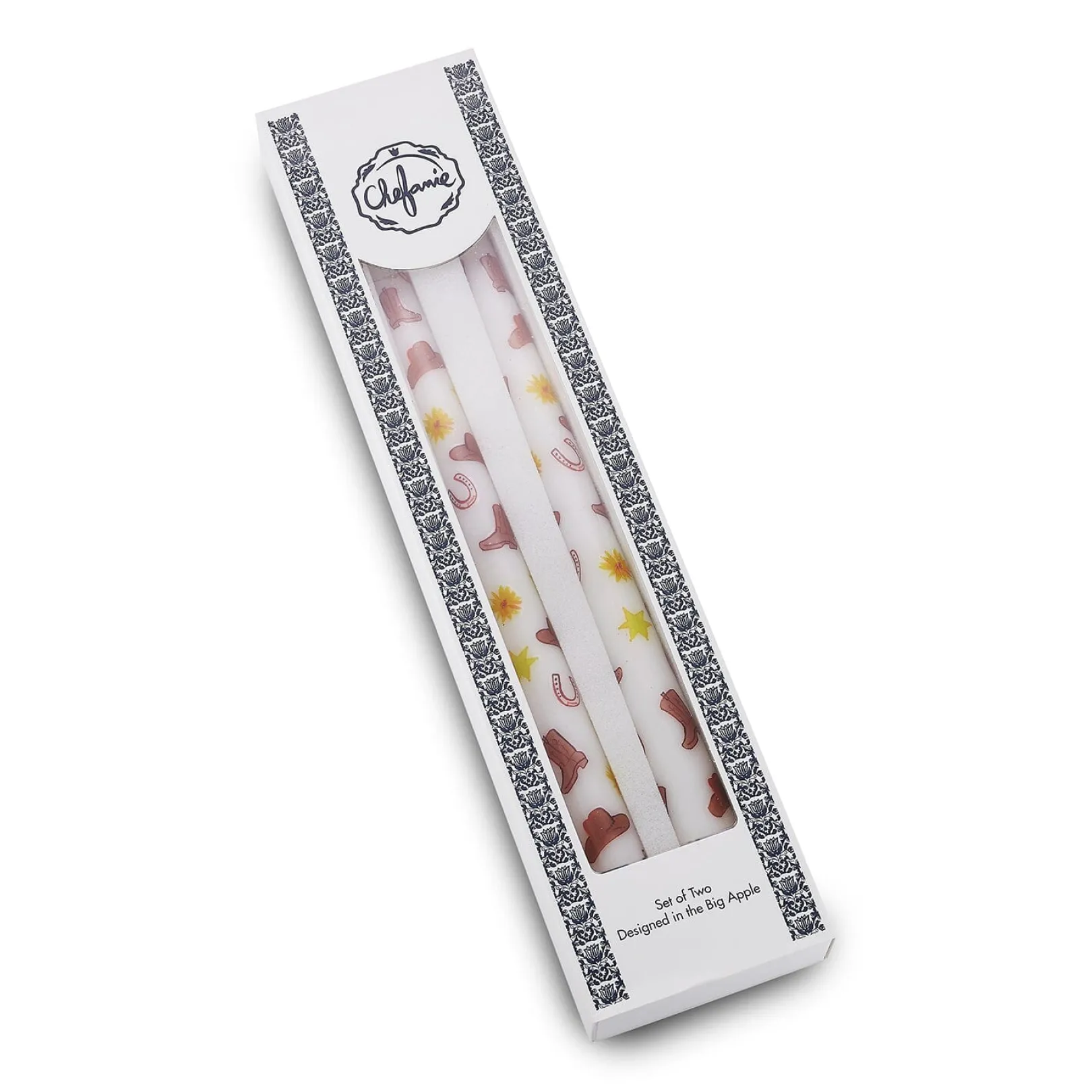 This set of 2 unscented taper candles is patterned with cowboy hats, boots, horseshoes, and stars. The motif is inspired by the West!