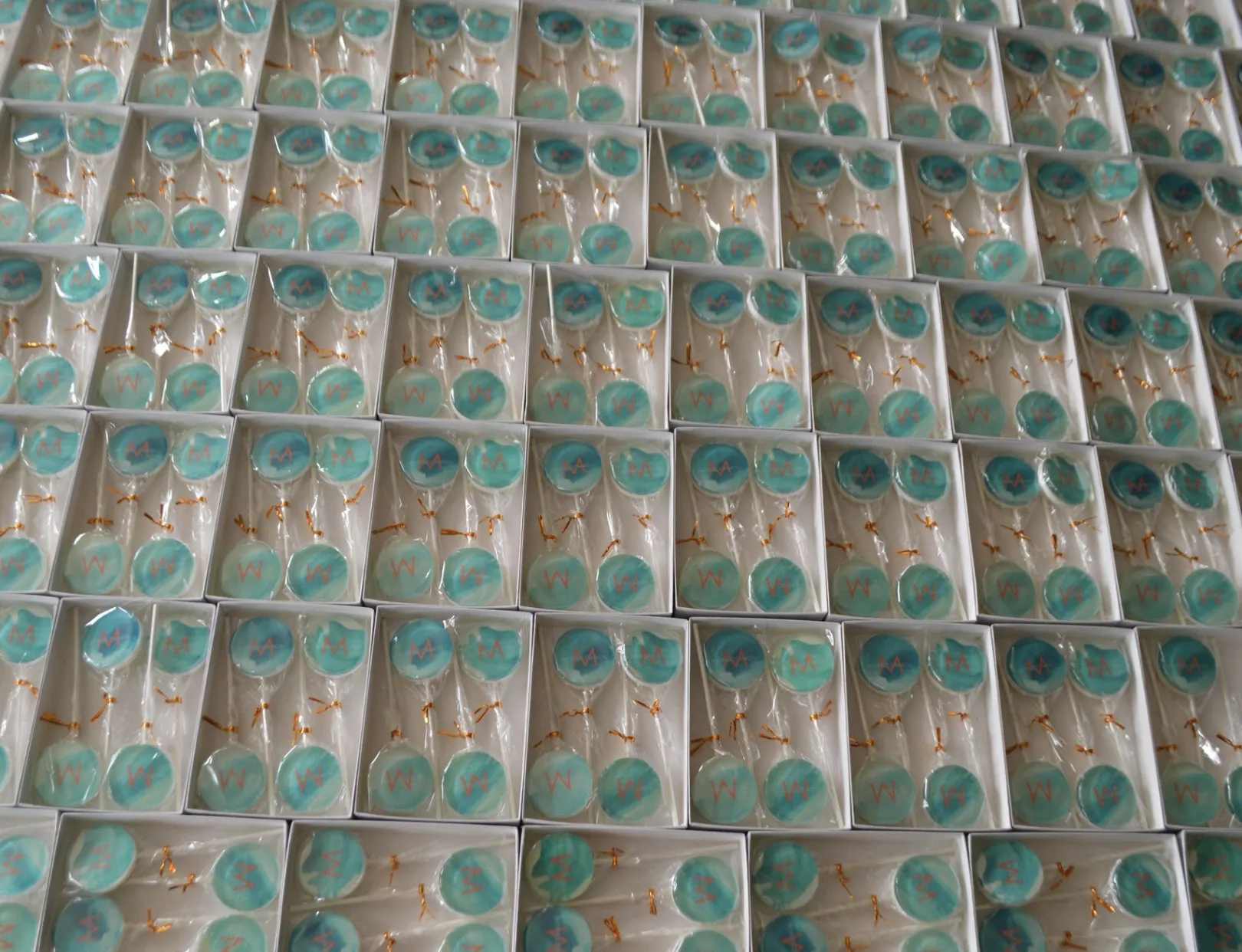 We create branded, patterned, and printed lollipops with logos, pictures, and patterns! Each lollipop is 2 inches in diameter, strawberry flavored, and individually wrapped. They are perfect for birthday parties, corporate events, bar/ bat mitzvahs, and weddings, as a party favor or addition to a treats bar. Each custom lollipop order requires 2 weeks of production. We ship nationwide within the US and deliver within the New York City area. Upon receipt of the order, customer provides artwork.