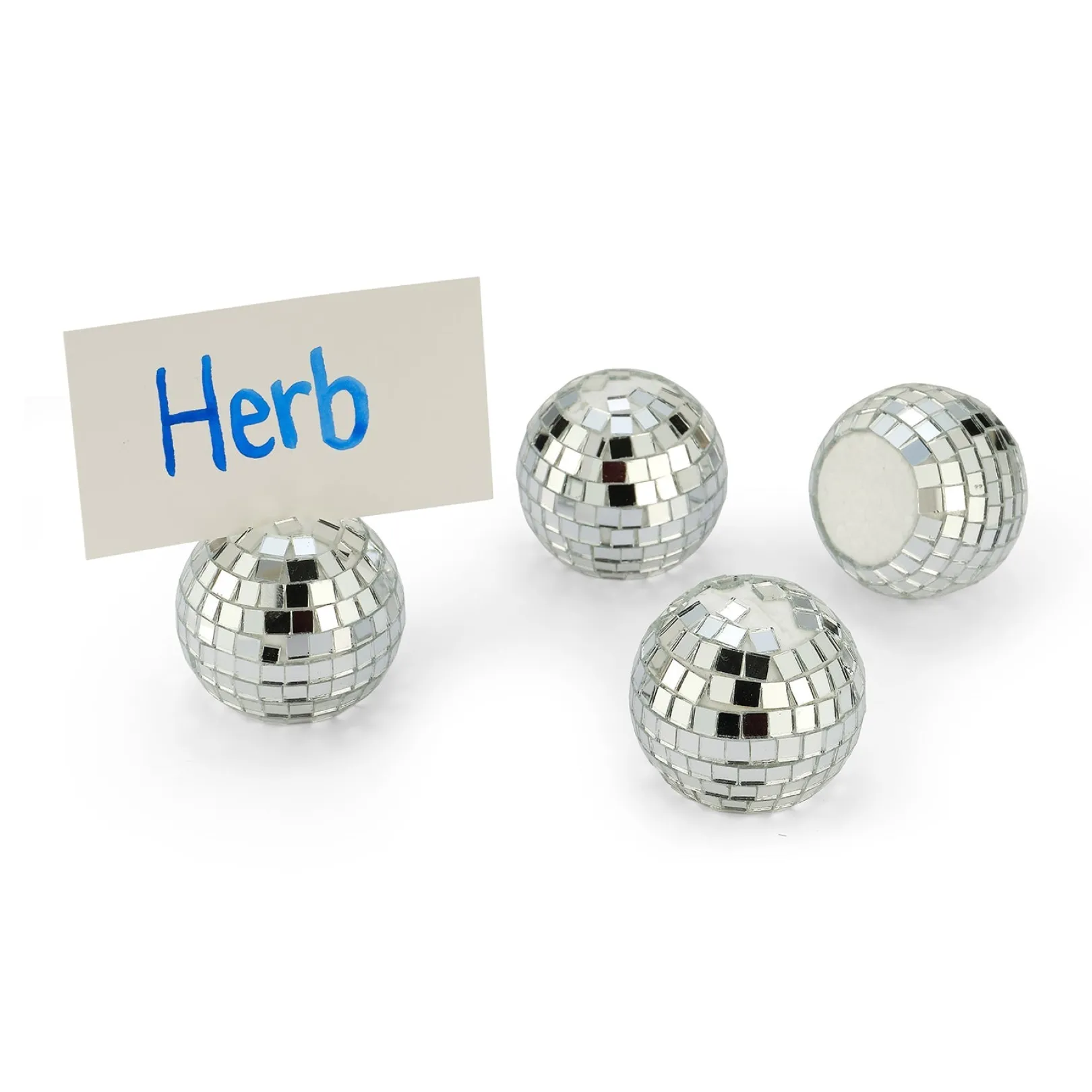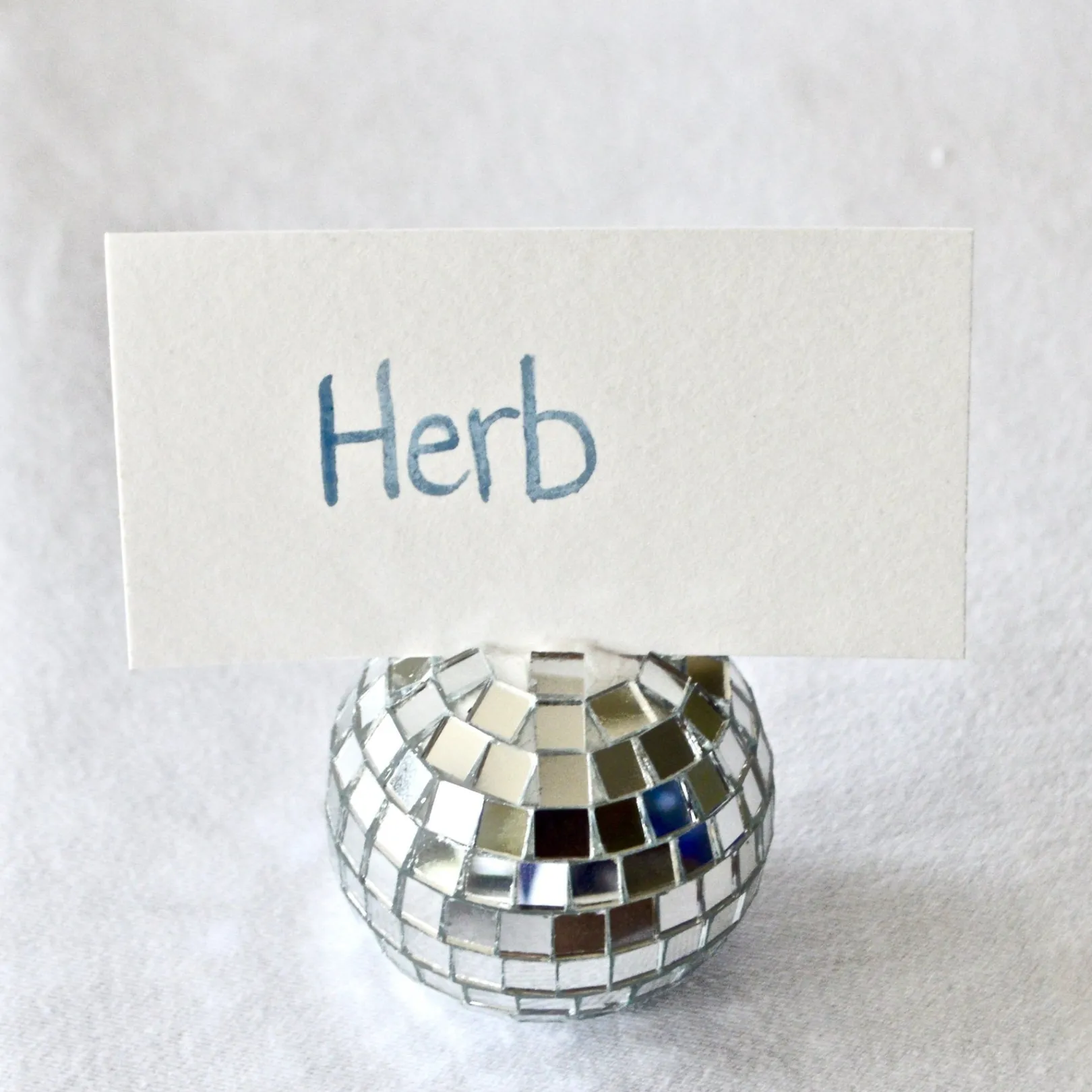 These miniature disco ball placecard holders will perch your guests’ names. As they are made by hand, there may be slight variations across balls.