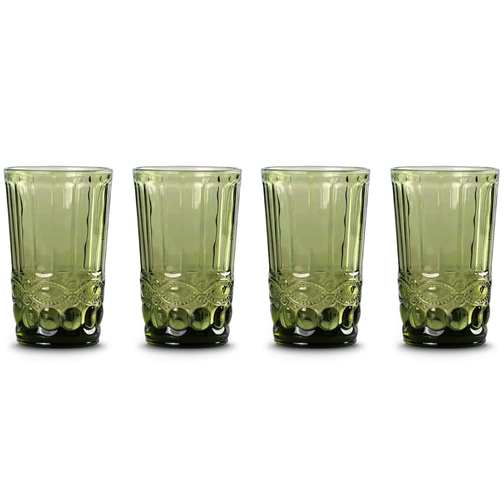 This set of 4 drinking glasses is pressed with a decorative floral motif.