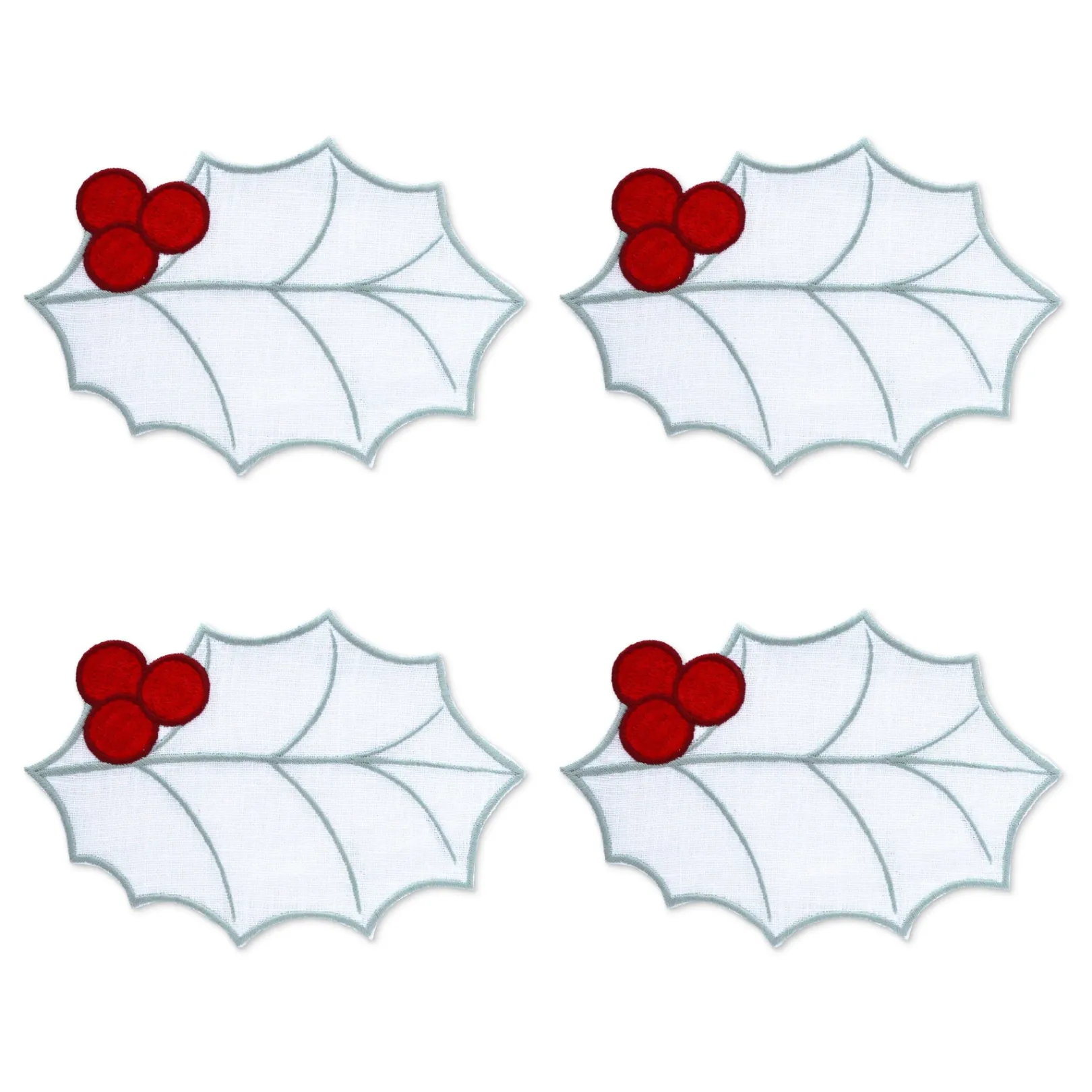 Shaped like a holly leaf with red berries, these linen fabric cocktail napkins are the cutest accessory at a tree trimming, holiday party or Christmas celebration.