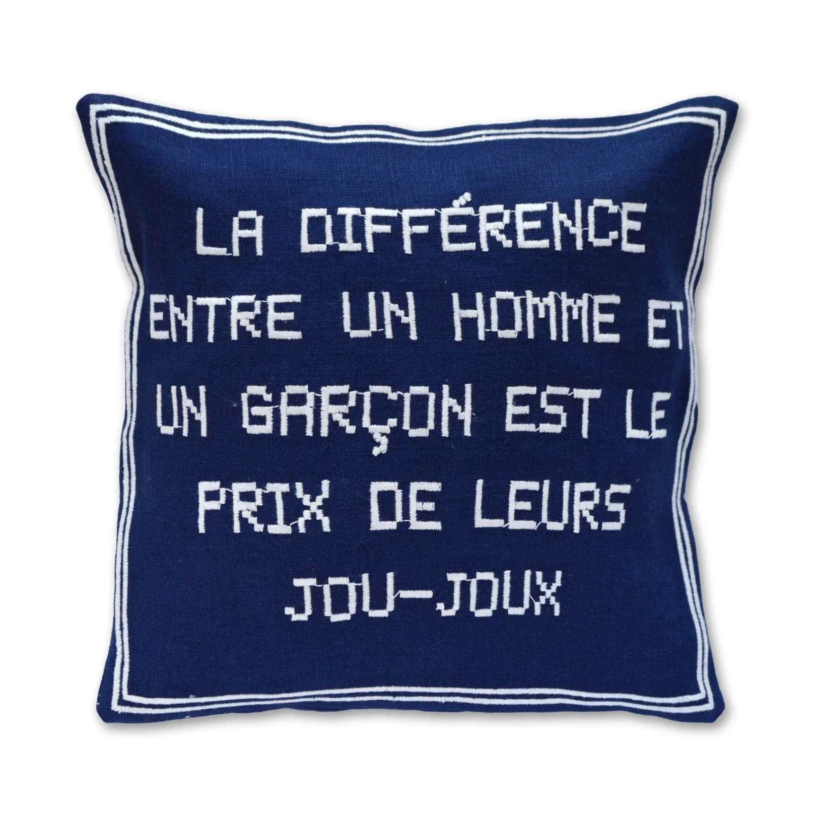 “The difference between a man and a boy is the price of his toys” Or in French, “la différence entre un homme et un garçon est le prix de leur jou-joux.” This decor item is the pillowcase that a man who has everything needs.