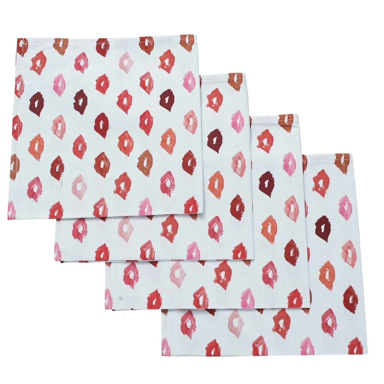 Sturdy fabric dinner napkins with kisses in different lipstick colors on a white background. Lovely for Valentine’s Day, bridal showers, and baby showers.