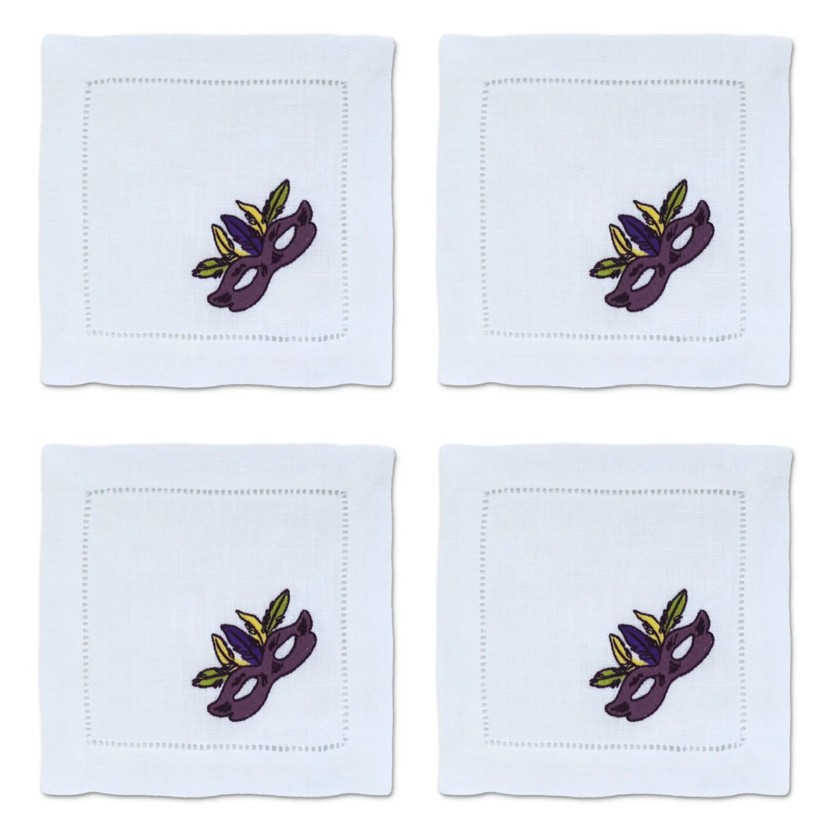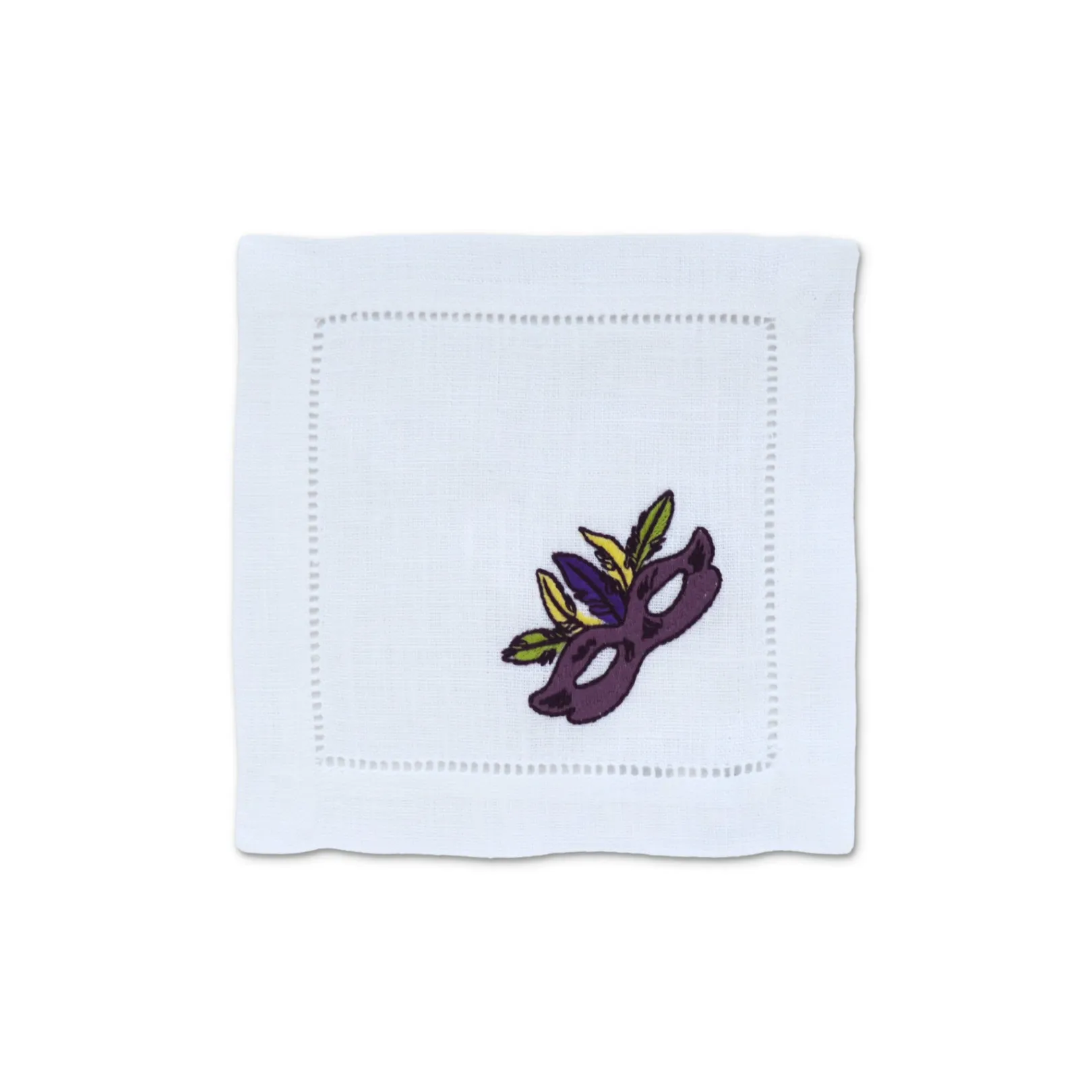 Cocktail napkins to transport you to Bourbon Street. The corner embroidery depicts a quintessential mardi gras mask in purple, yellow, and green.