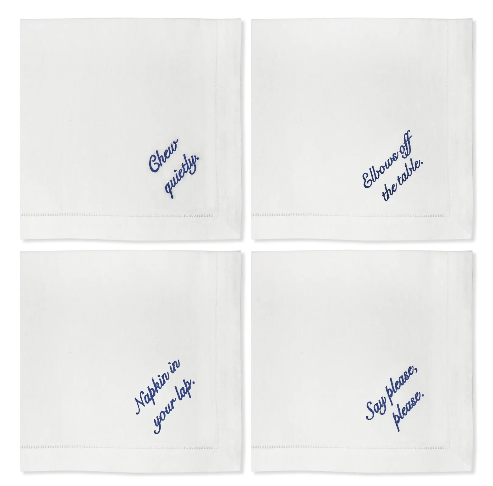 A napkin set that Emily Post would love! Each napkin shares some table wisdom: ” Say please, please.”; “Chew quietly.”; “Elbows off the table.”; and “Napkin in your lap.”