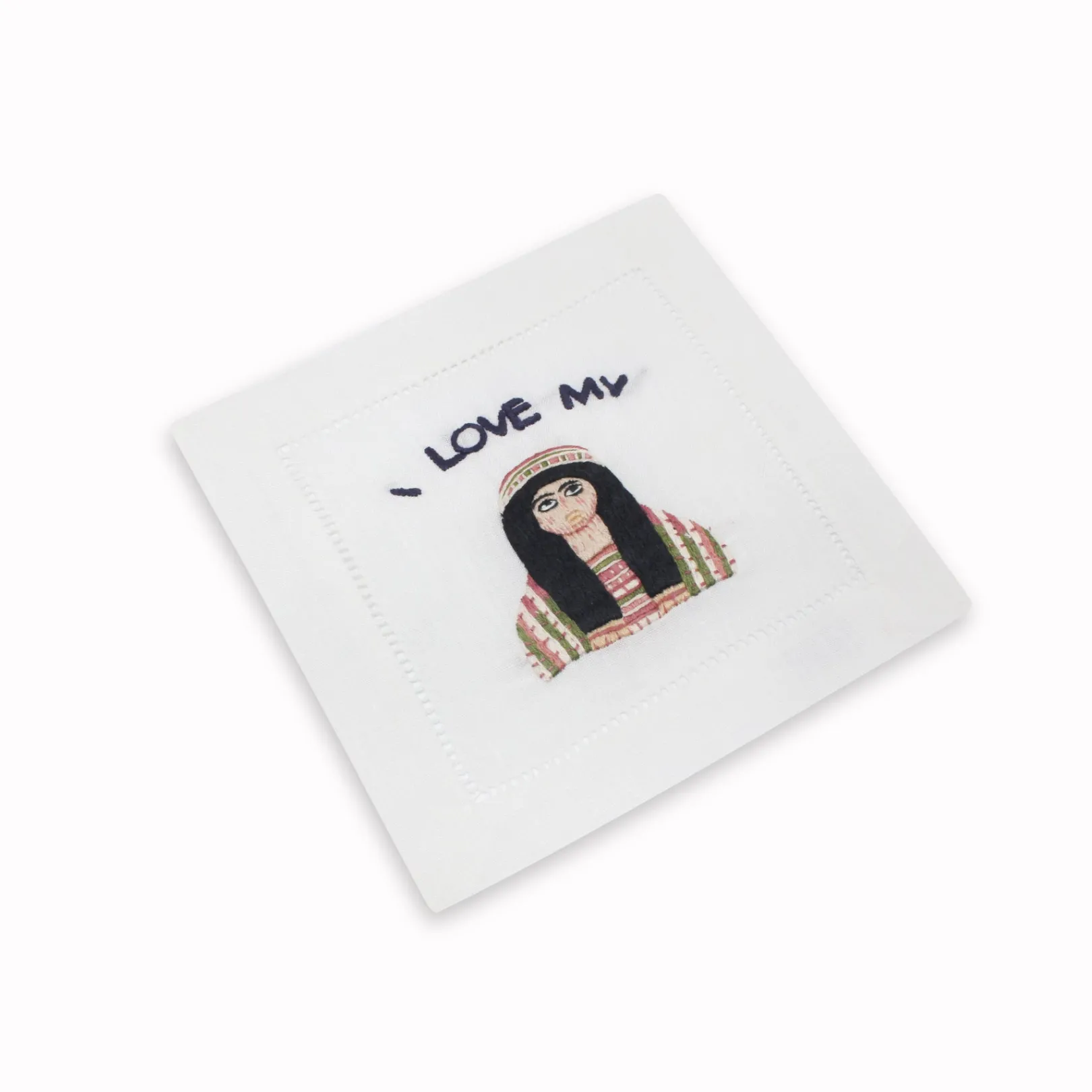 Embroidered on hemstitch linen napkin.