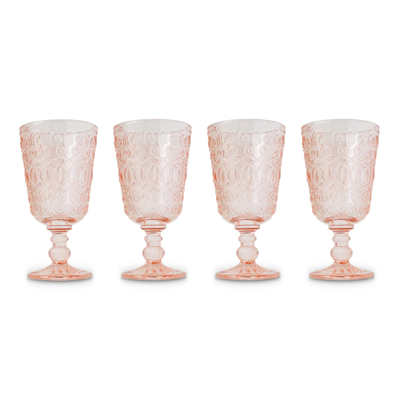 This set of 4 drinking glasses is pressed with a decorative floral motif.