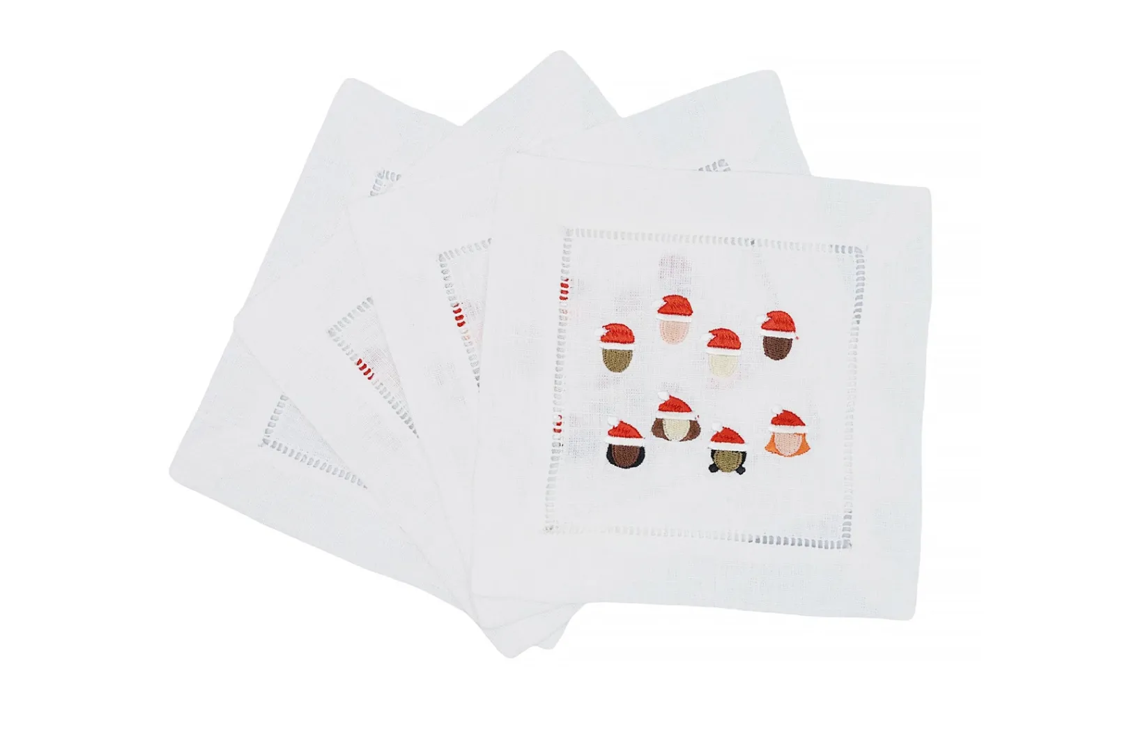 Embroideries of a diverse set of Santa Claus characters wearing red hats