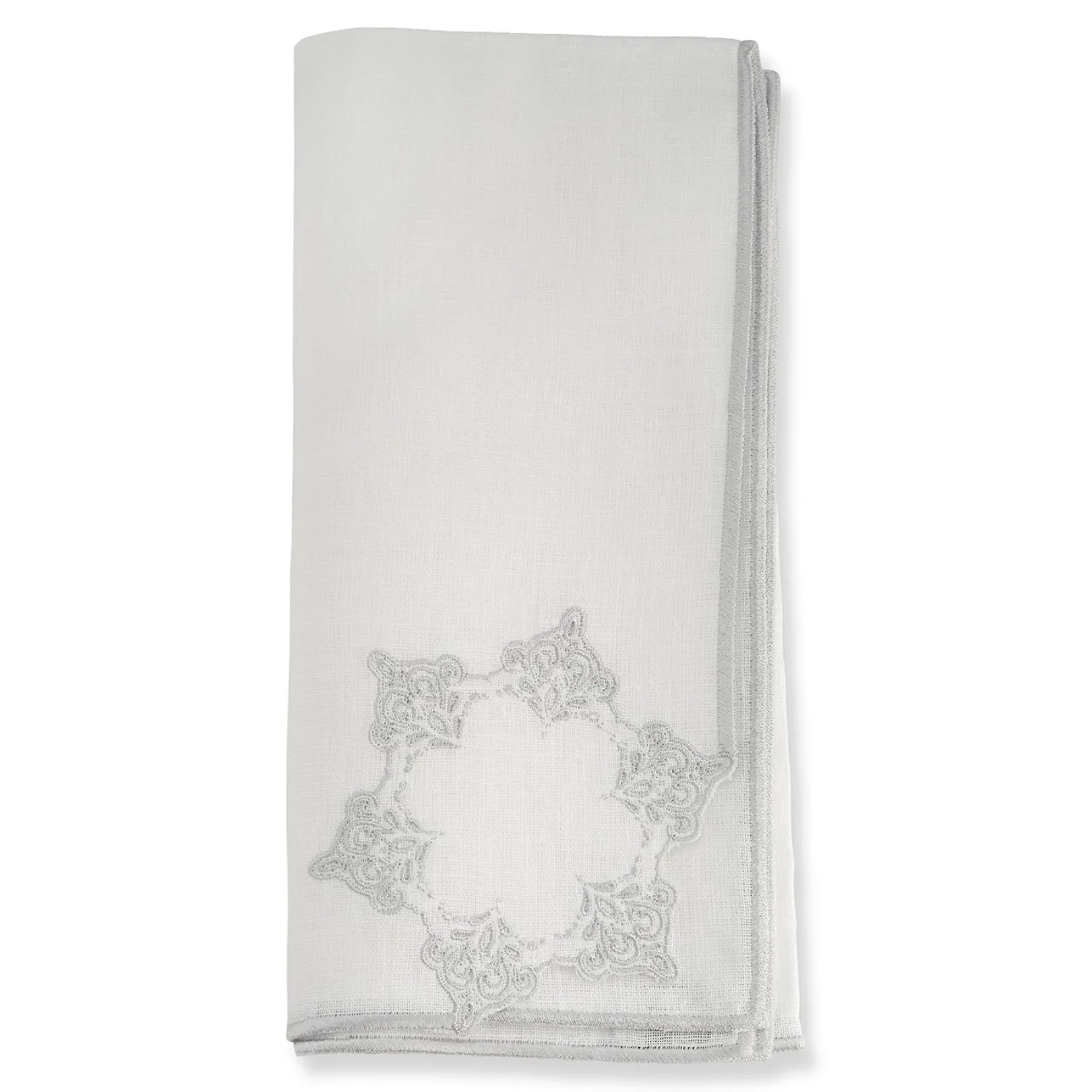 A set of dinner napkins featuring a timeless snowflake embroidery and shape.