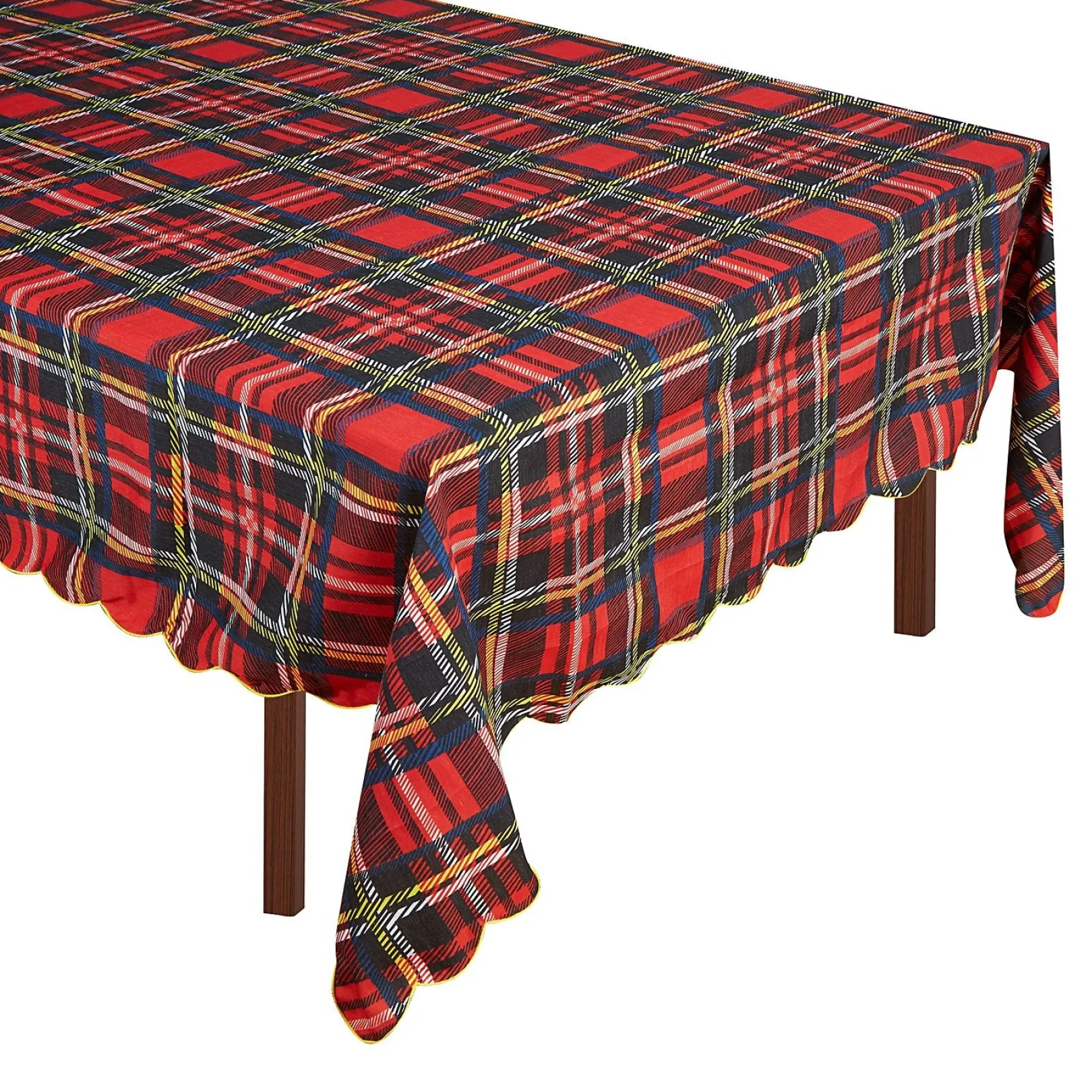 The perfect foundation for your holiday table, this red “Stewart” tartan plaid tablecloth.