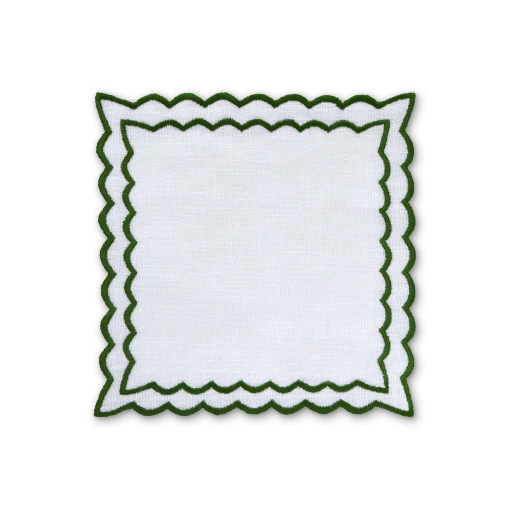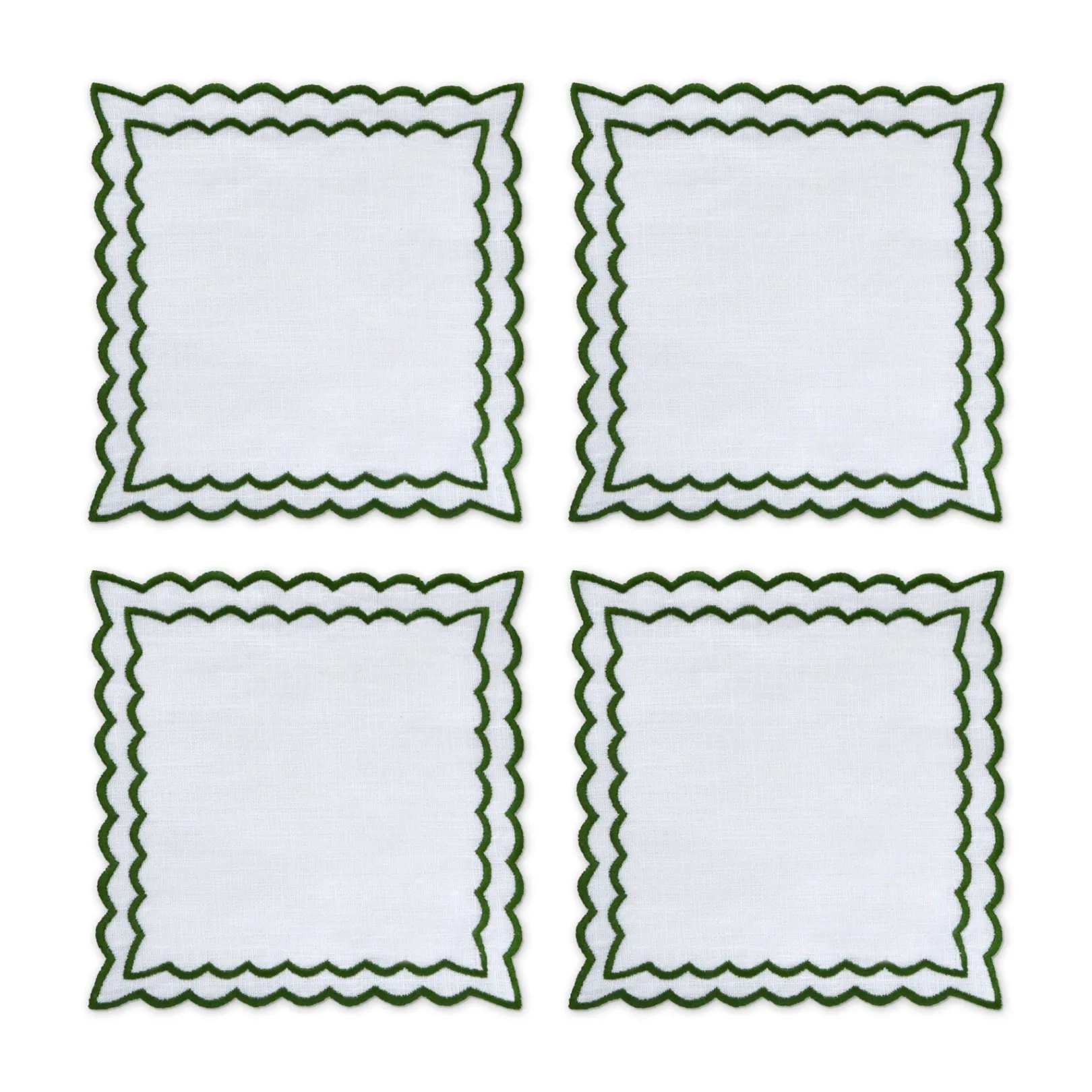 Classics are always in style. These white linen square cocktail napkins feature a whimsical dark green border.