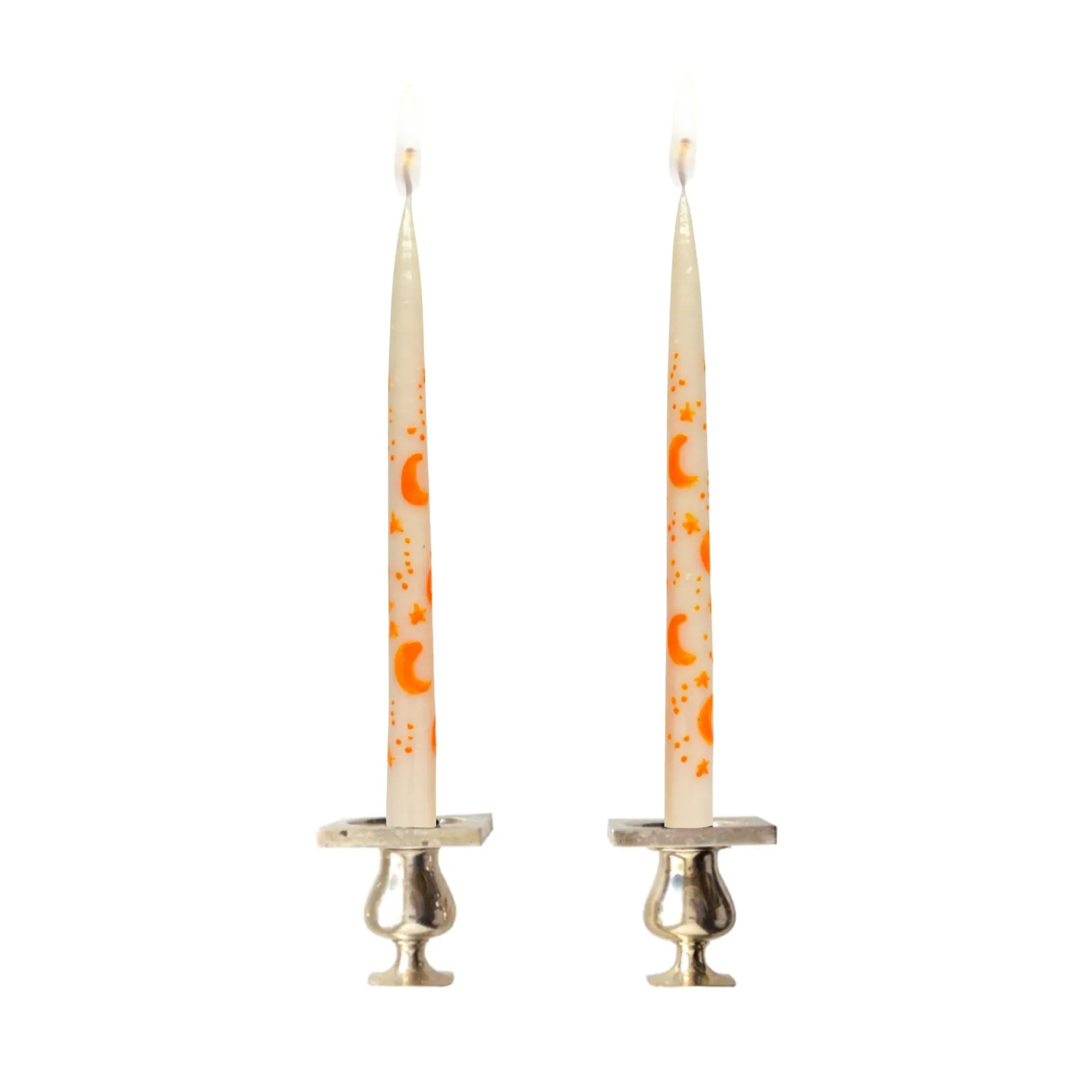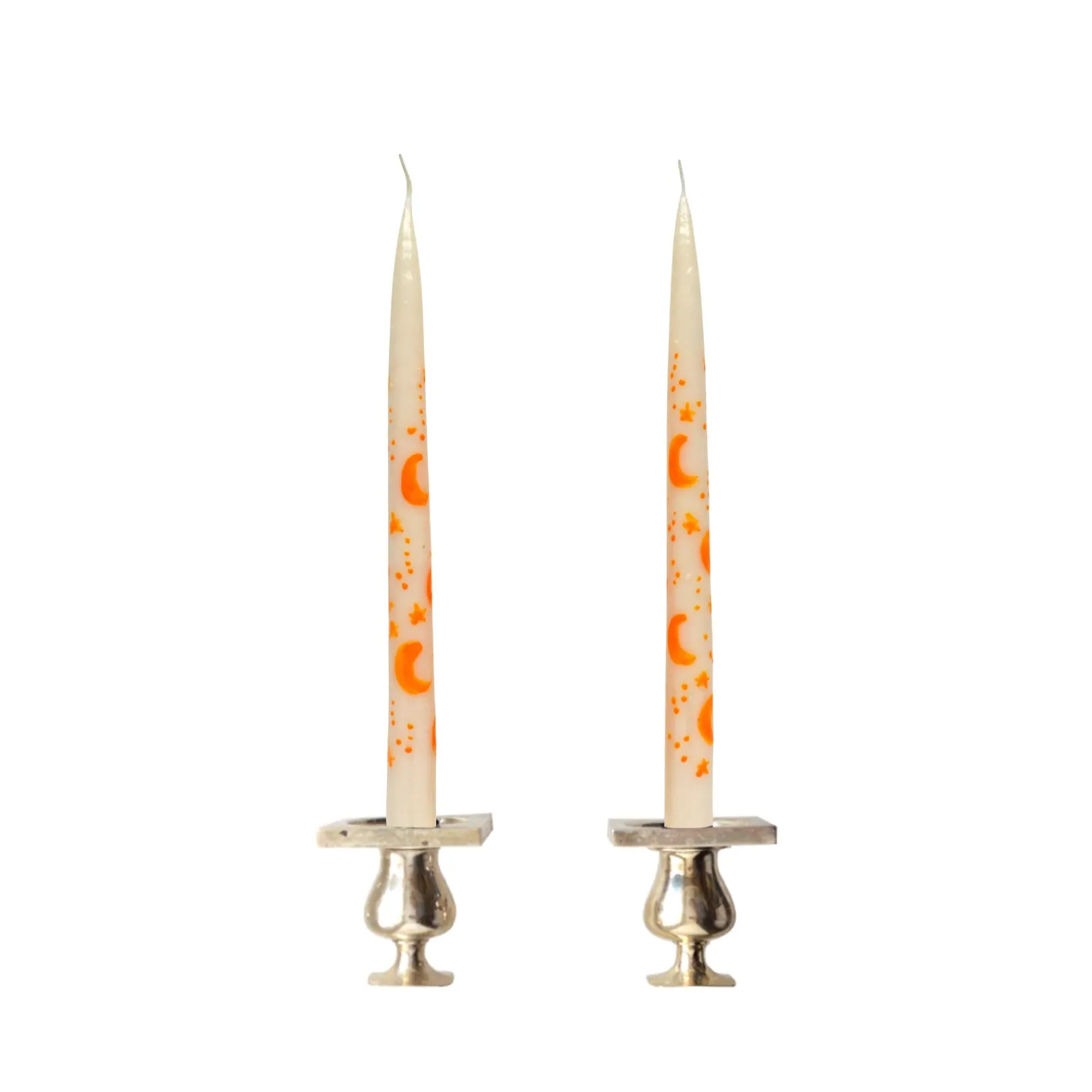 Gold stars and moons are hand painted on this set of 2 unscented, white taper candles.