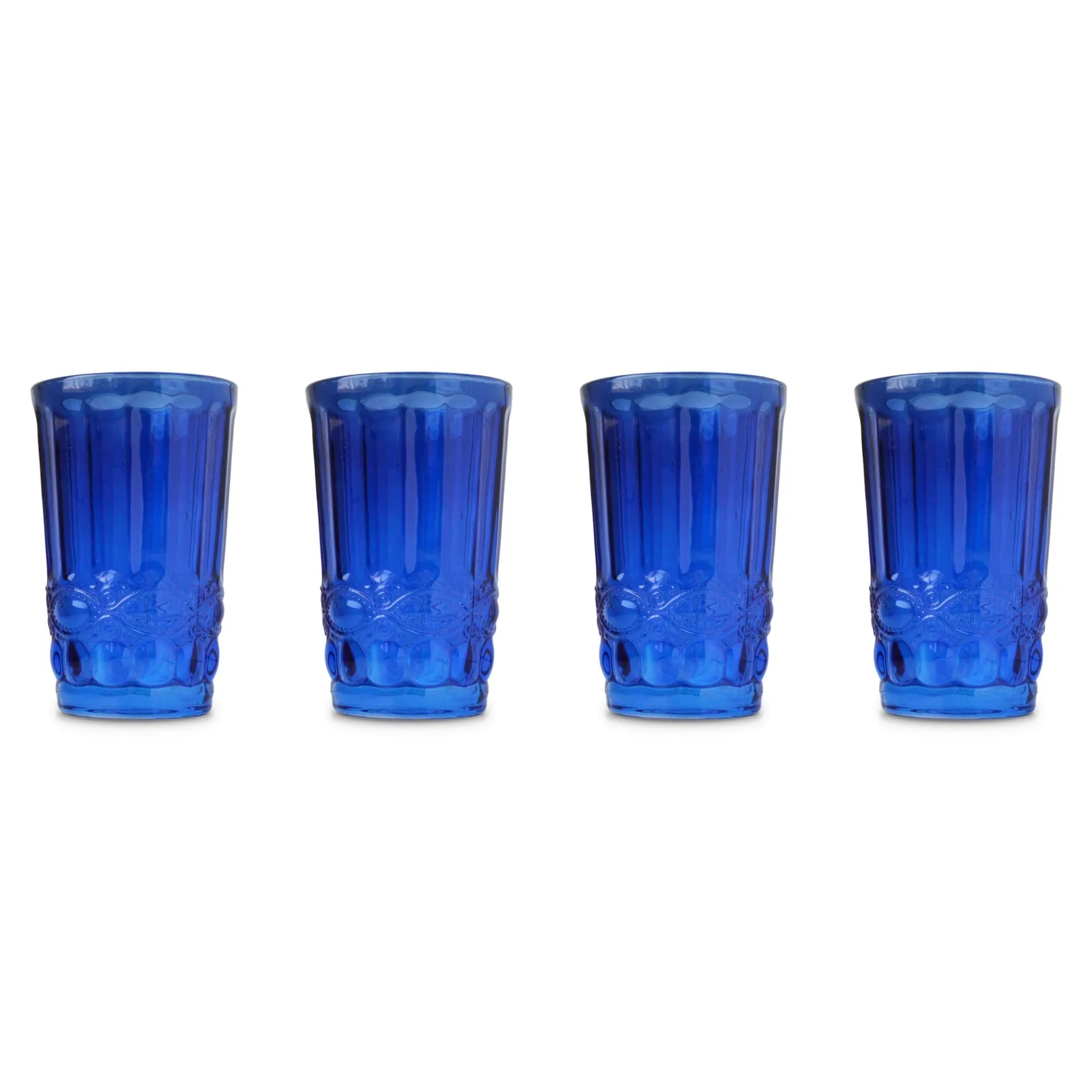 This set of 4 drinking glasses is pressed with a decorative floral motif.
