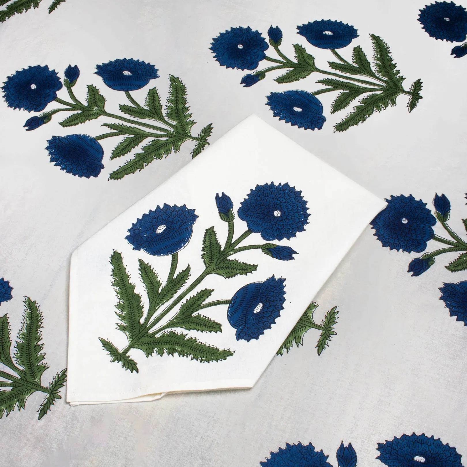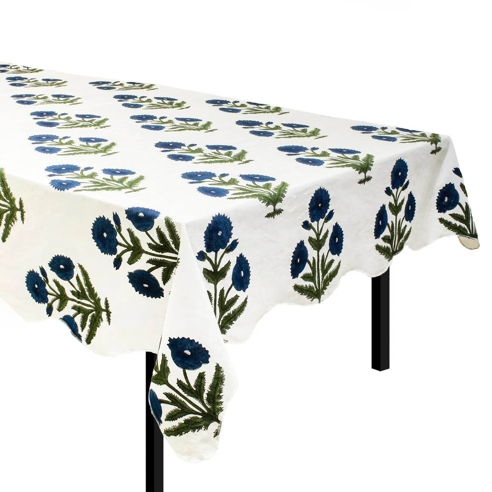 This blue and green poppy block-printed, rectangular tablecloth is available in 60 x 86 inches. Elegant all year round.