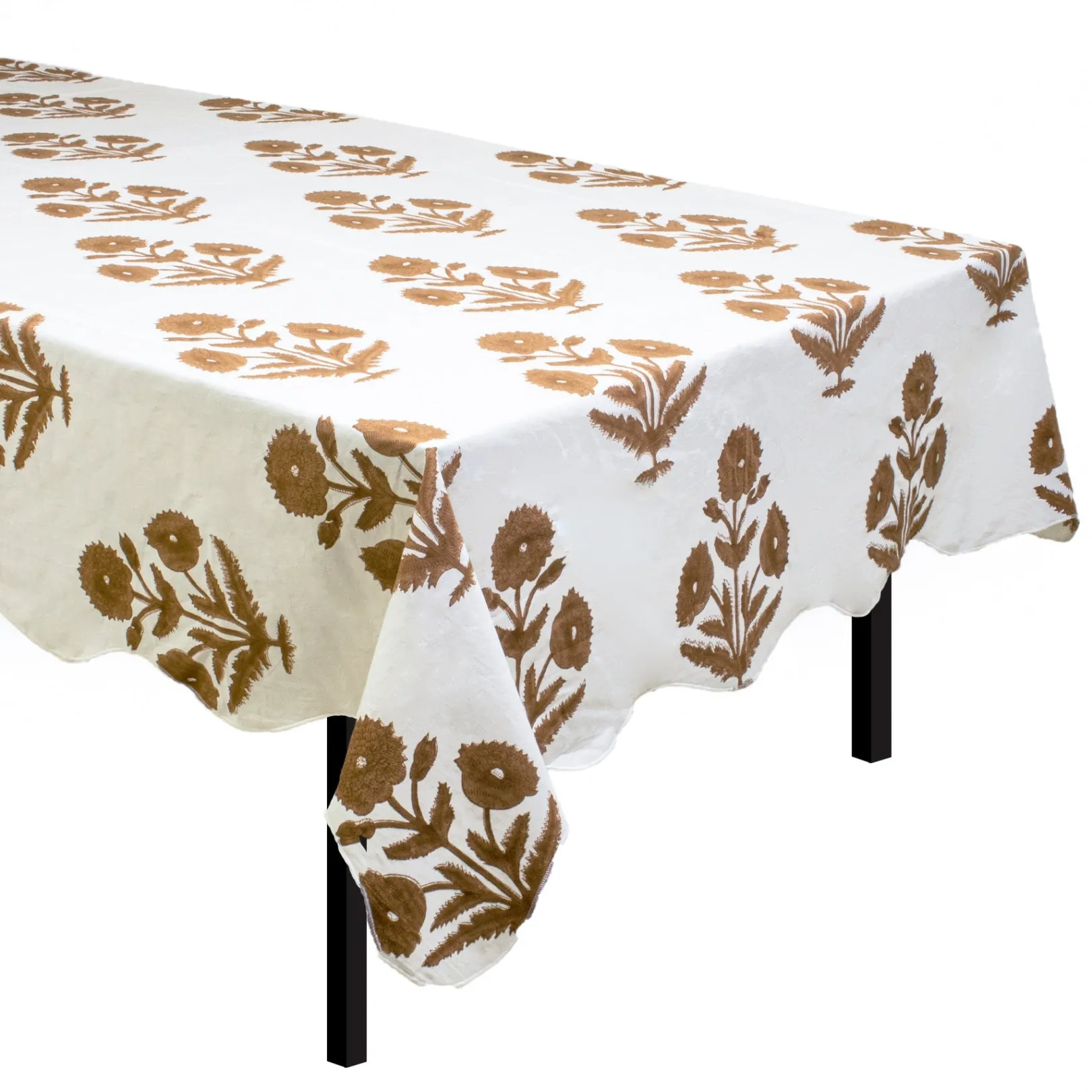 Each tablecloth is 100% cotton and finished with a scalloped edge. There may be variations in size, shape, and color across tablecloths, as they are printed by hand.