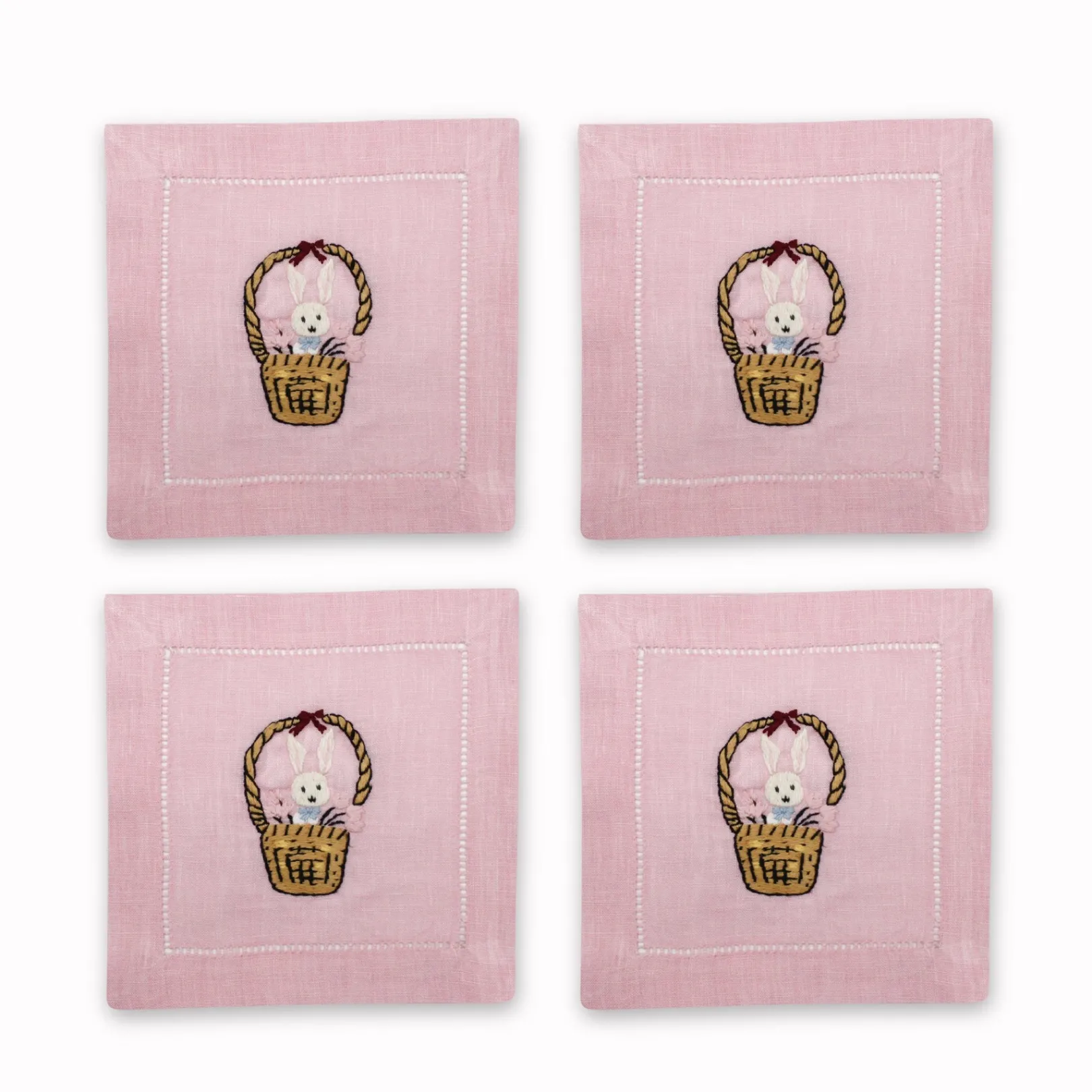 Baby rabbits represent spring all over the world. The bunny popping out of a basket on this pink cocktail napkin is perfect for spring entertaining: for Easter, Passover, or other occasions.