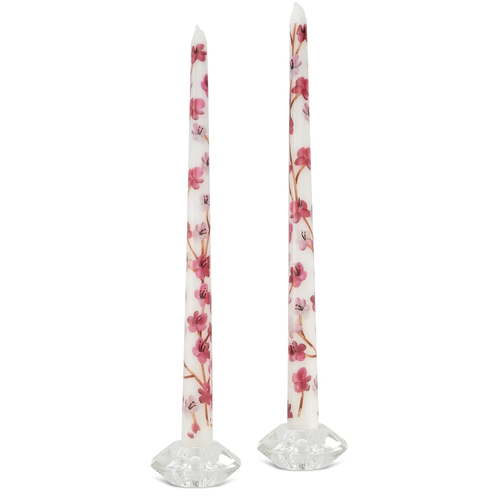 This set of 2 unscented taper candles is decorated with a motif of pink cherry blossom branches.