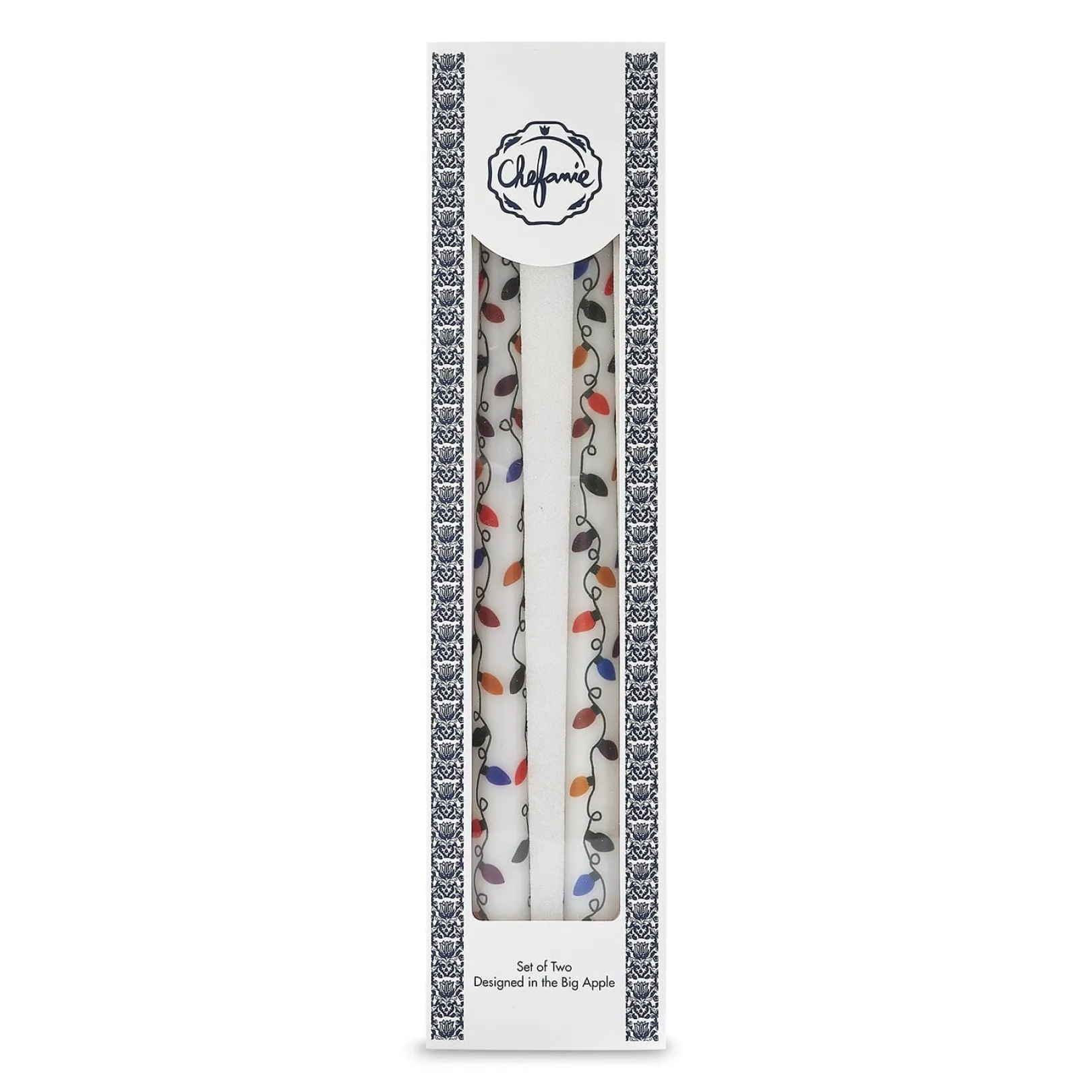 This set of 2 unscented taper candles is patterned festively. The motif is colorful Christmas lights on a white candle.