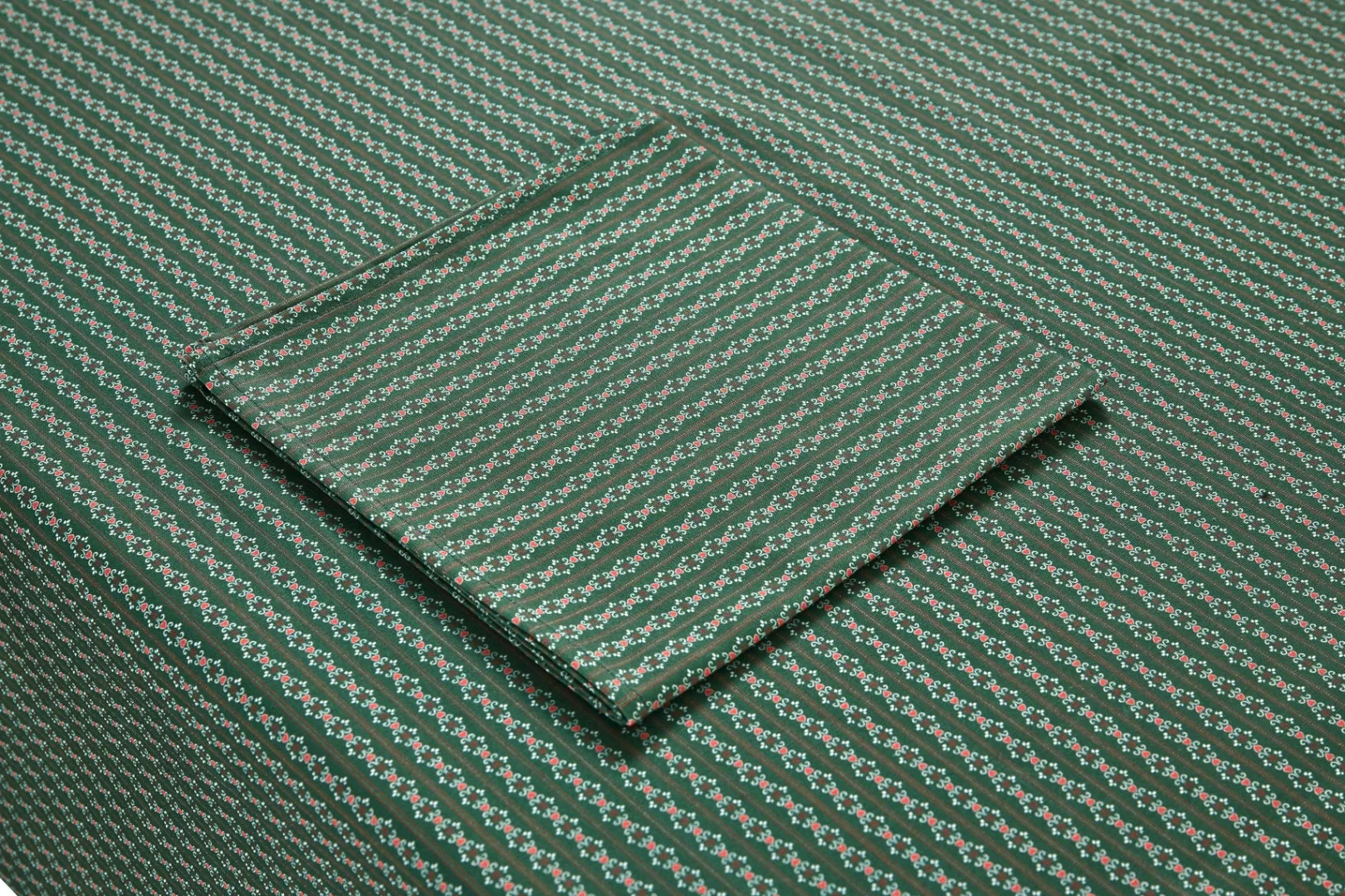 Inspired by vintage fabric, this red, white, and green printed tablecloth features small hearts and is a festive covering for Christmas parties.