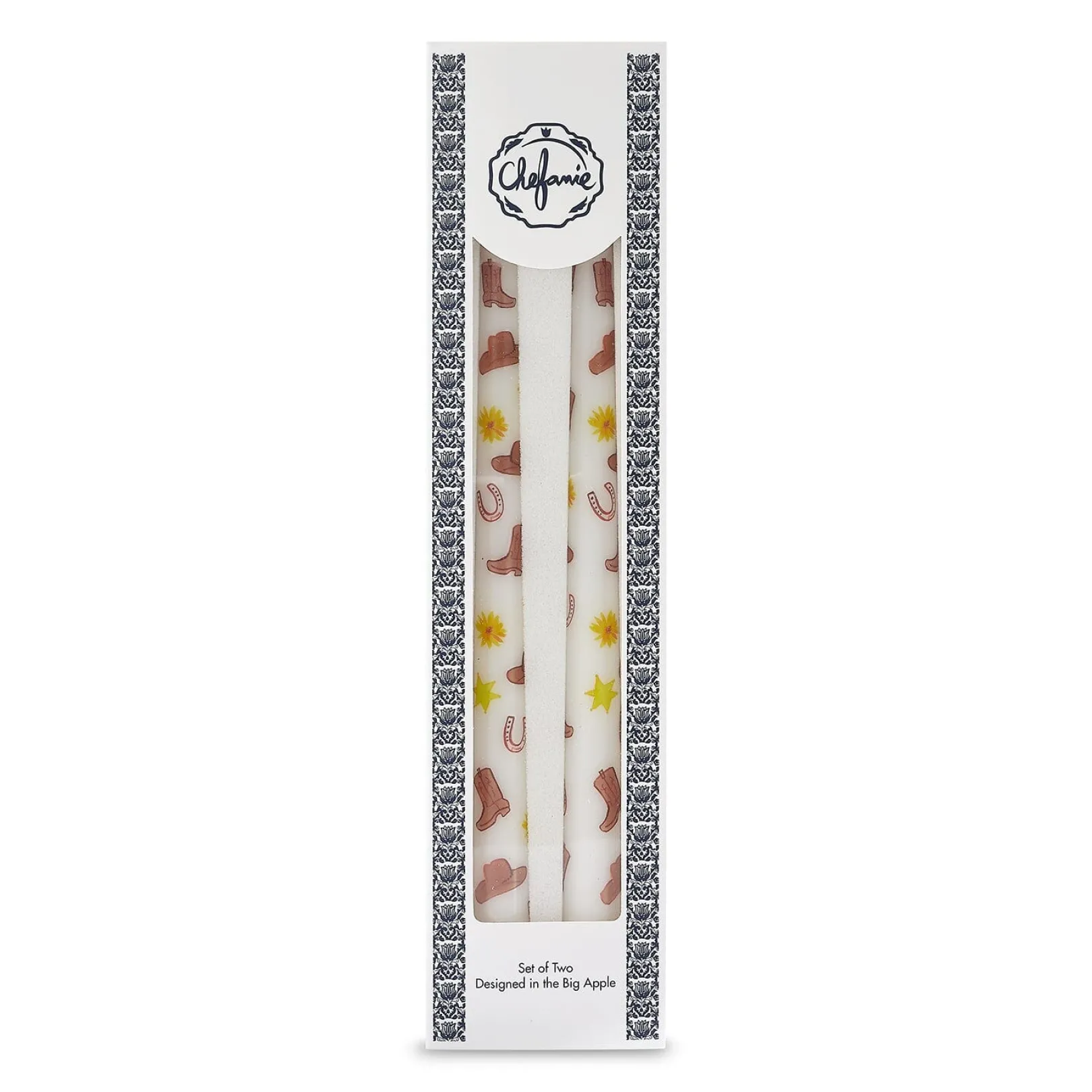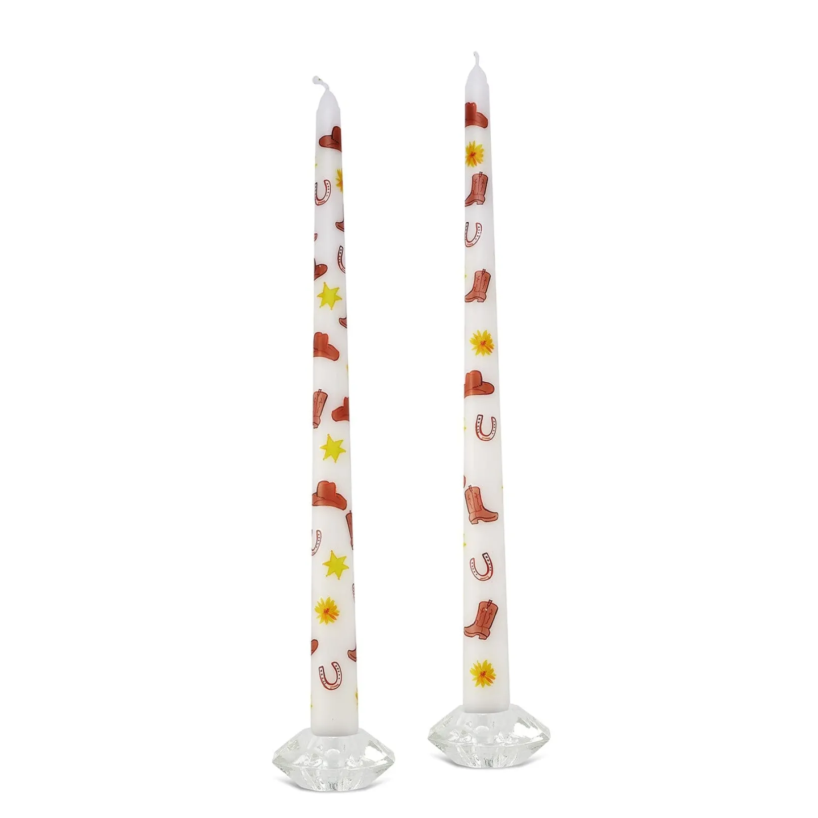 This set of 2 unscented taper candles is patterned with cowboy hats, boots, horseshoes, and stars. The motif is inspired by the West!