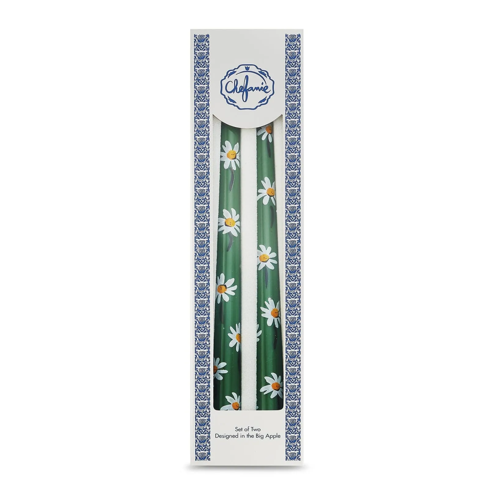 This set of 2 unscented taper candles is painted by hand. The motif is delicate daisies on a green background. Perfect to match your Y2K style.