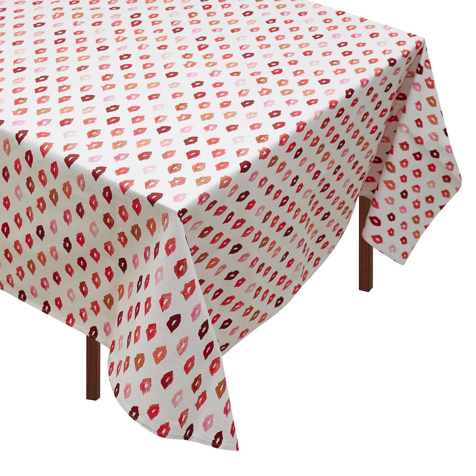 Tablecloth dotted with kiss stains in a range of reds and pinks.