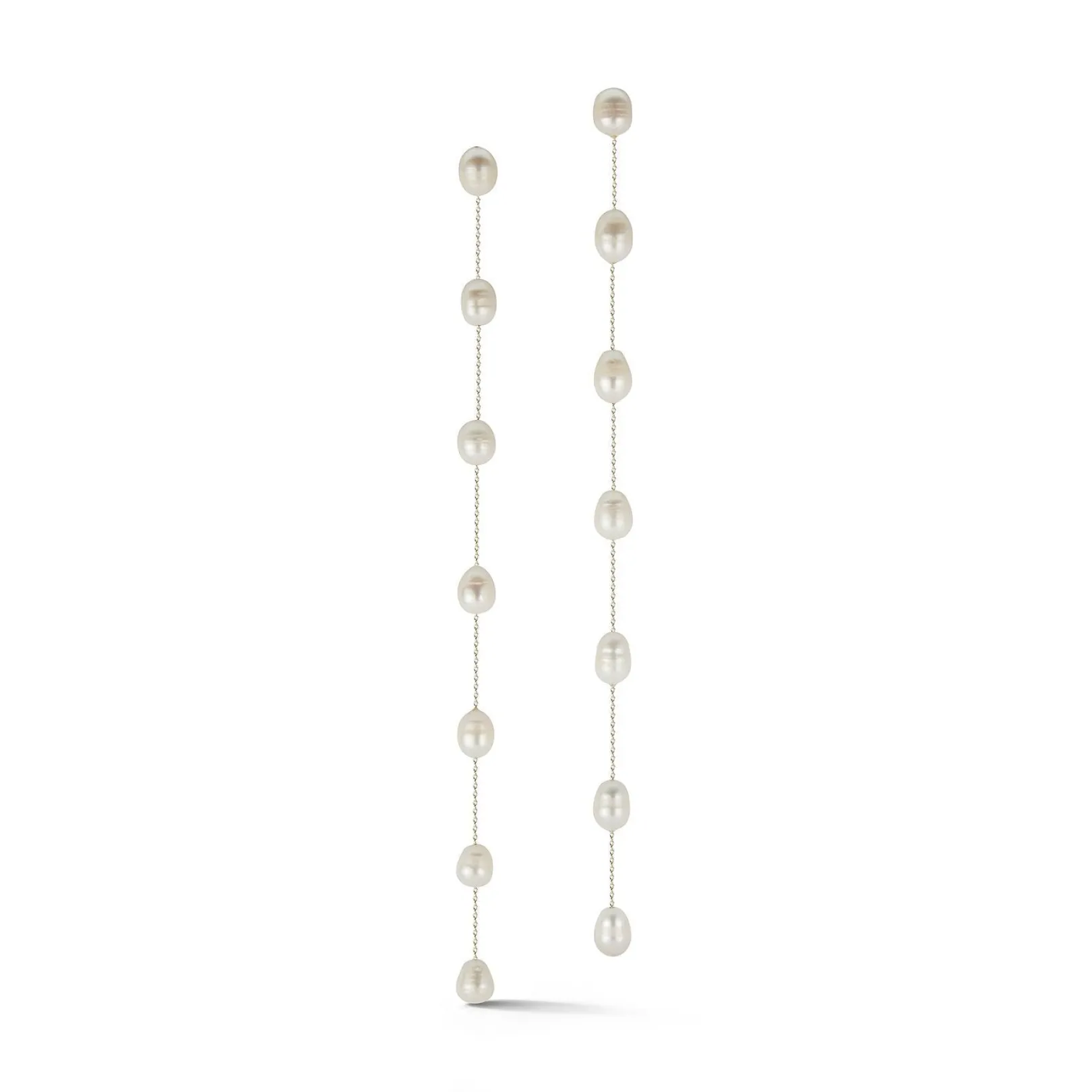 Seven pearls, on an 8.5 inch copper chain, swing across the shoulders . These earrings are for pierced ears and are equally lovely with a bathing suit as over a gown.