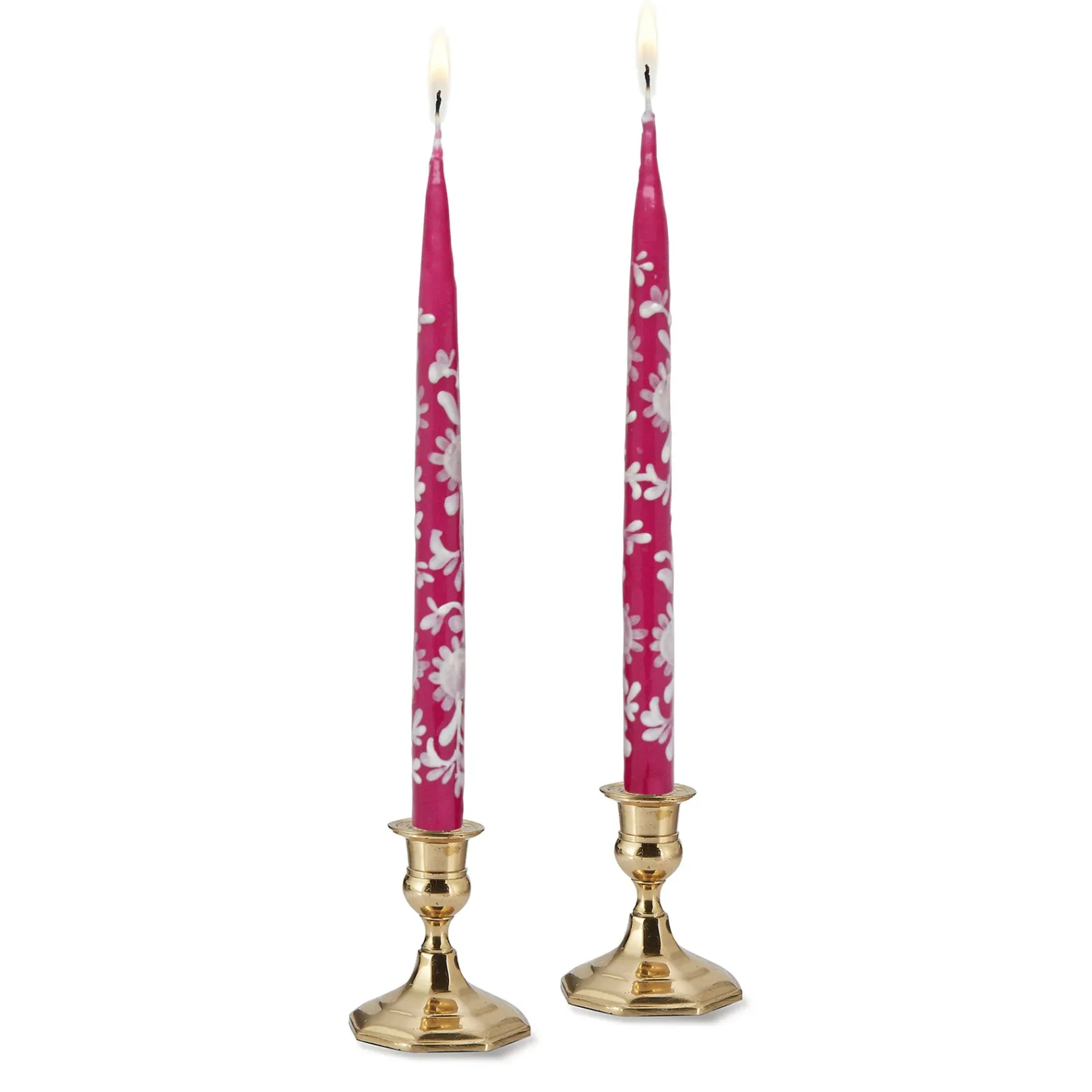This set of 2 unscented taper candles is painted by hand. The motif is white chinoiserie-inspired flora on a pink candle.