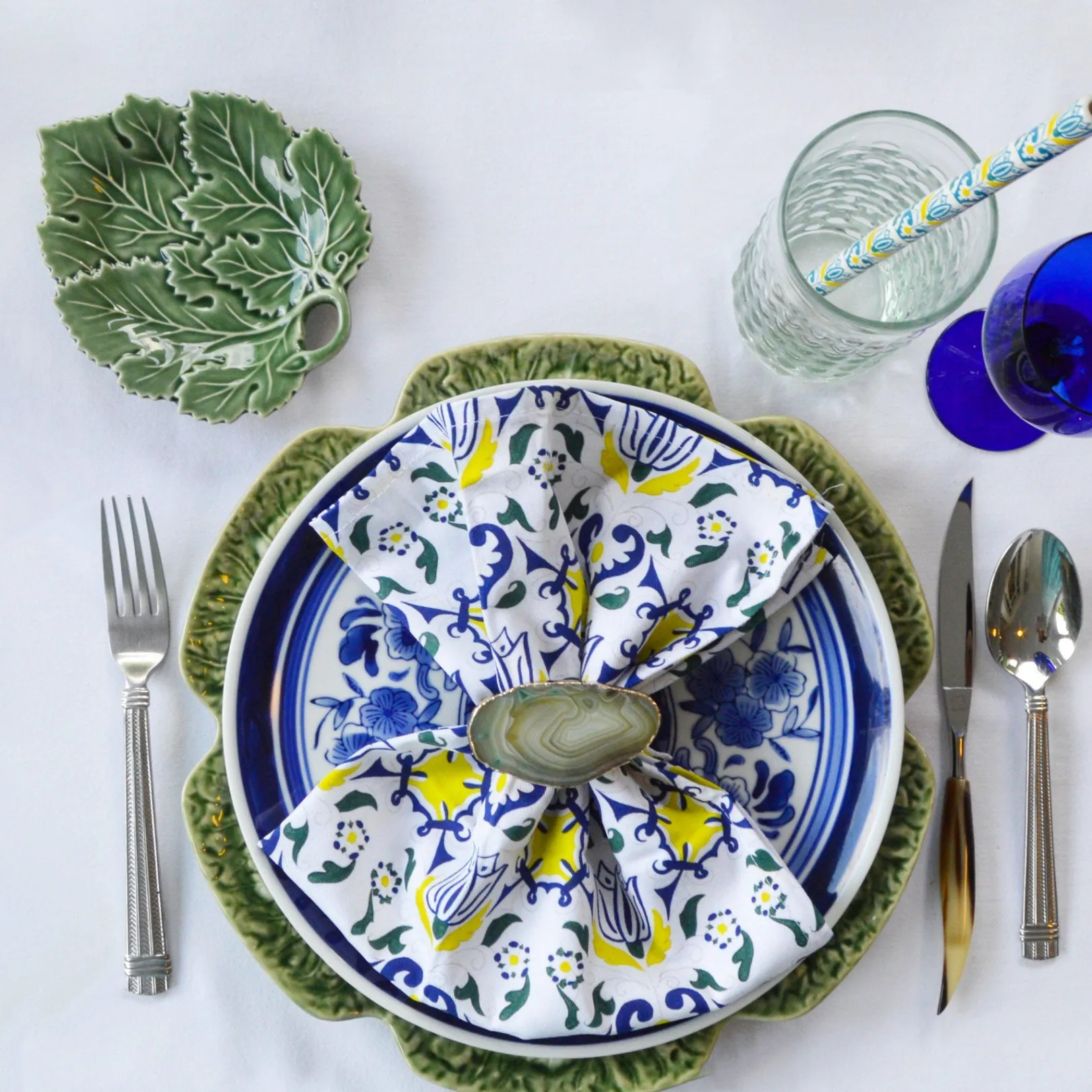 Inspired by Dutch tiles, these blue, green, and yellow dinner napkins will perk up your table setting! They can be used for casual breakfasts or more formal dinners.