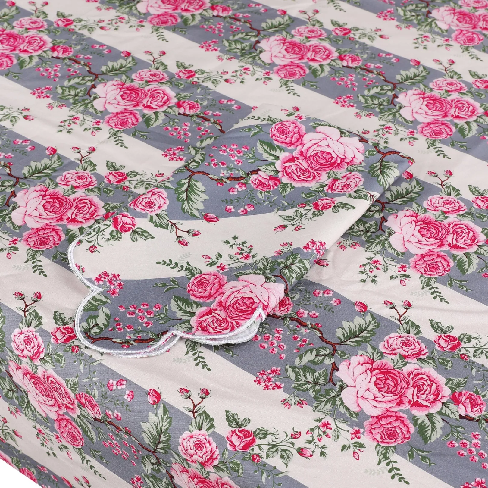 This rose patterned, rectangular tablecloth has navy blue stripes.